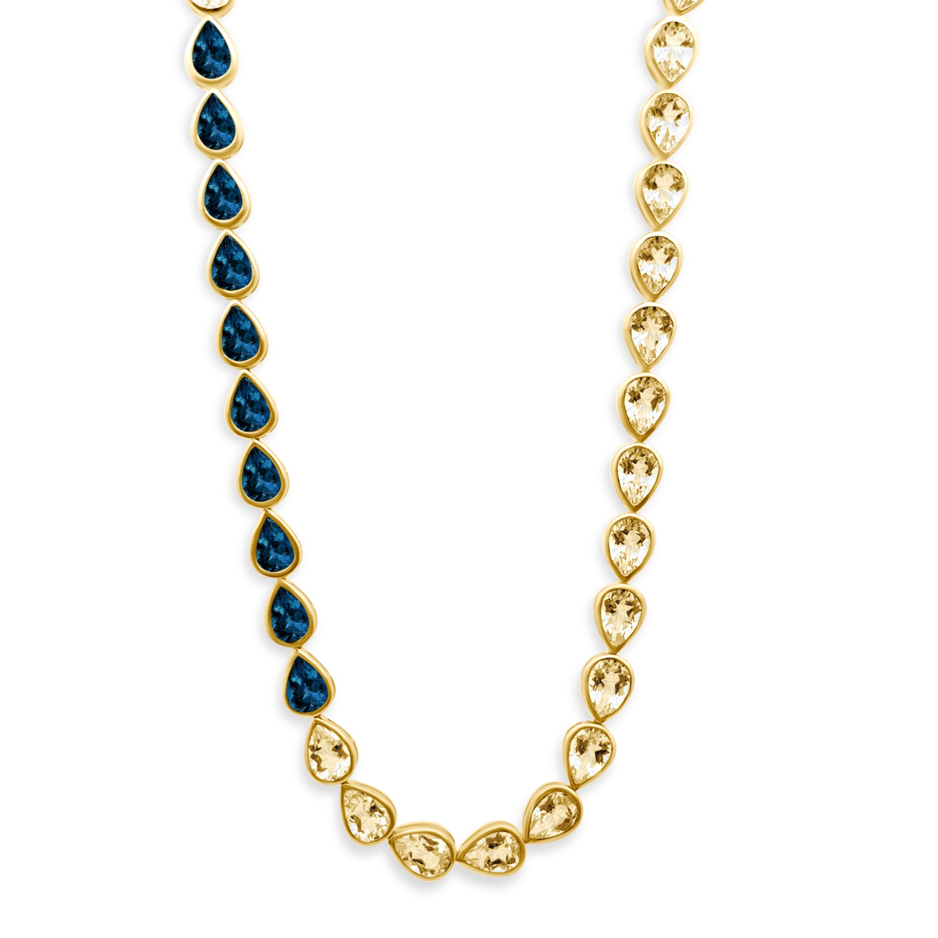 Pear cut gemstones bezel set in 14K yellow gold. This showstopping tennis necklace can be customized in various ways. 14K... Read more
