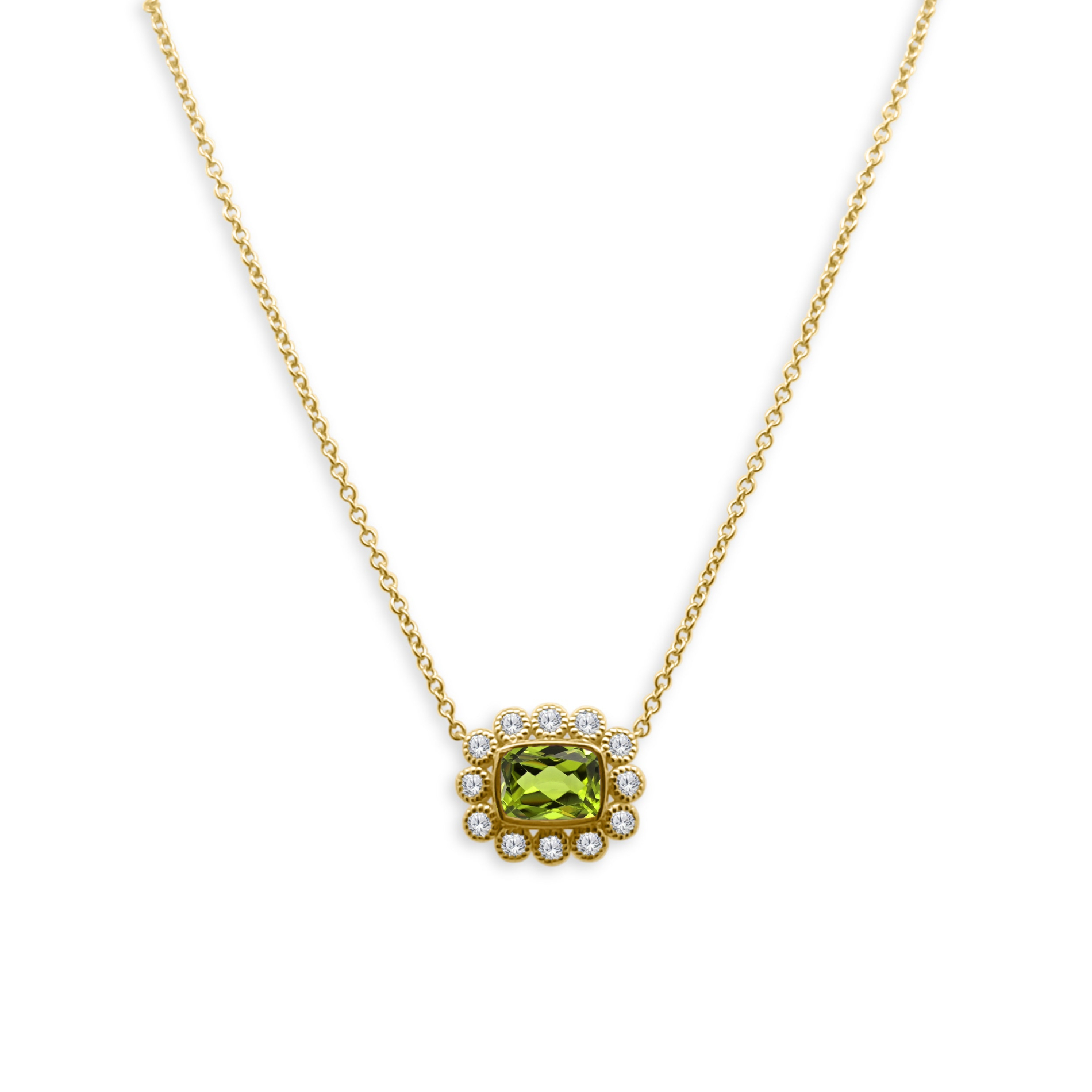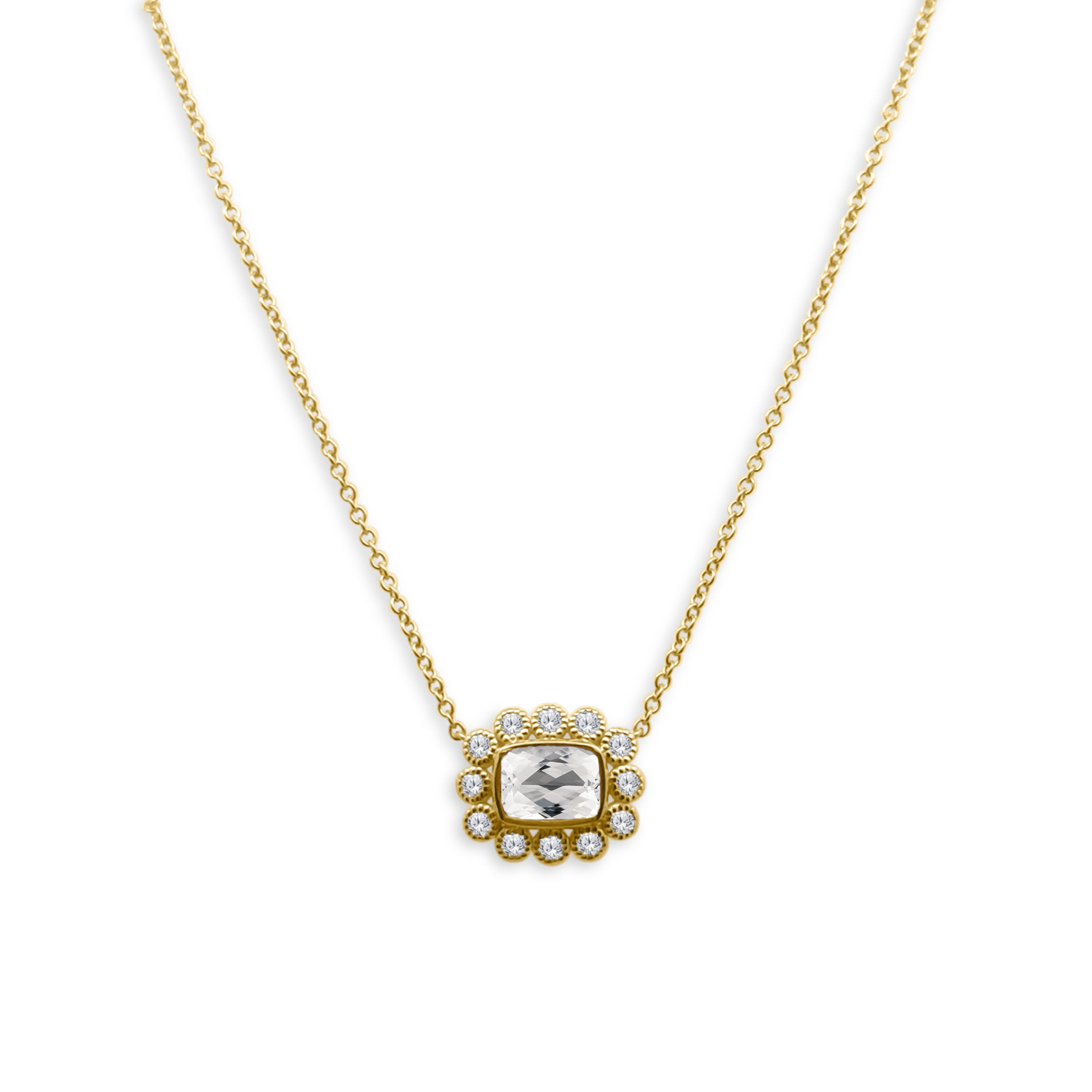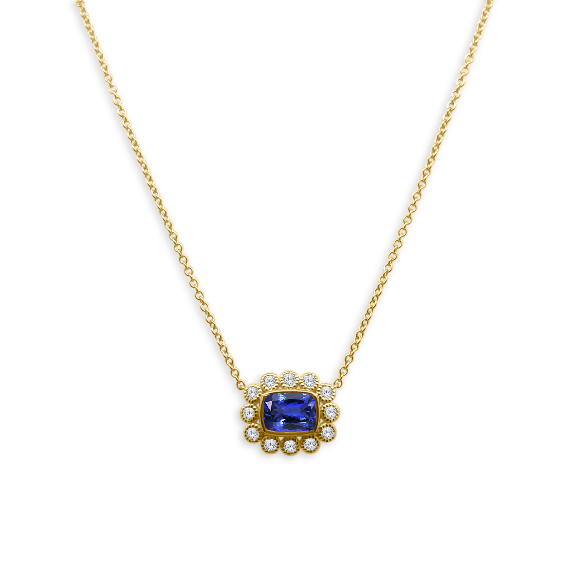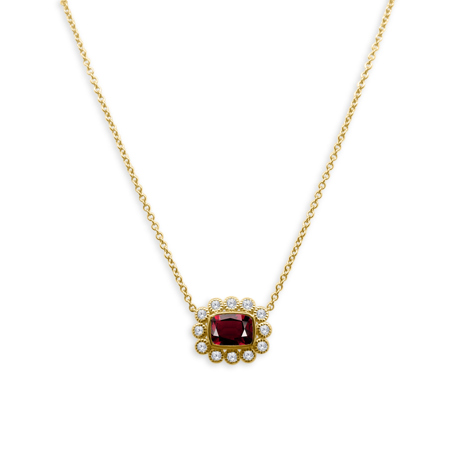 <li>1.0ct cushion cut gemstone bezel set with a roughly 0.30cttw diamond halo bezel set with milgrain detailing in 14K yellow gold.</li>