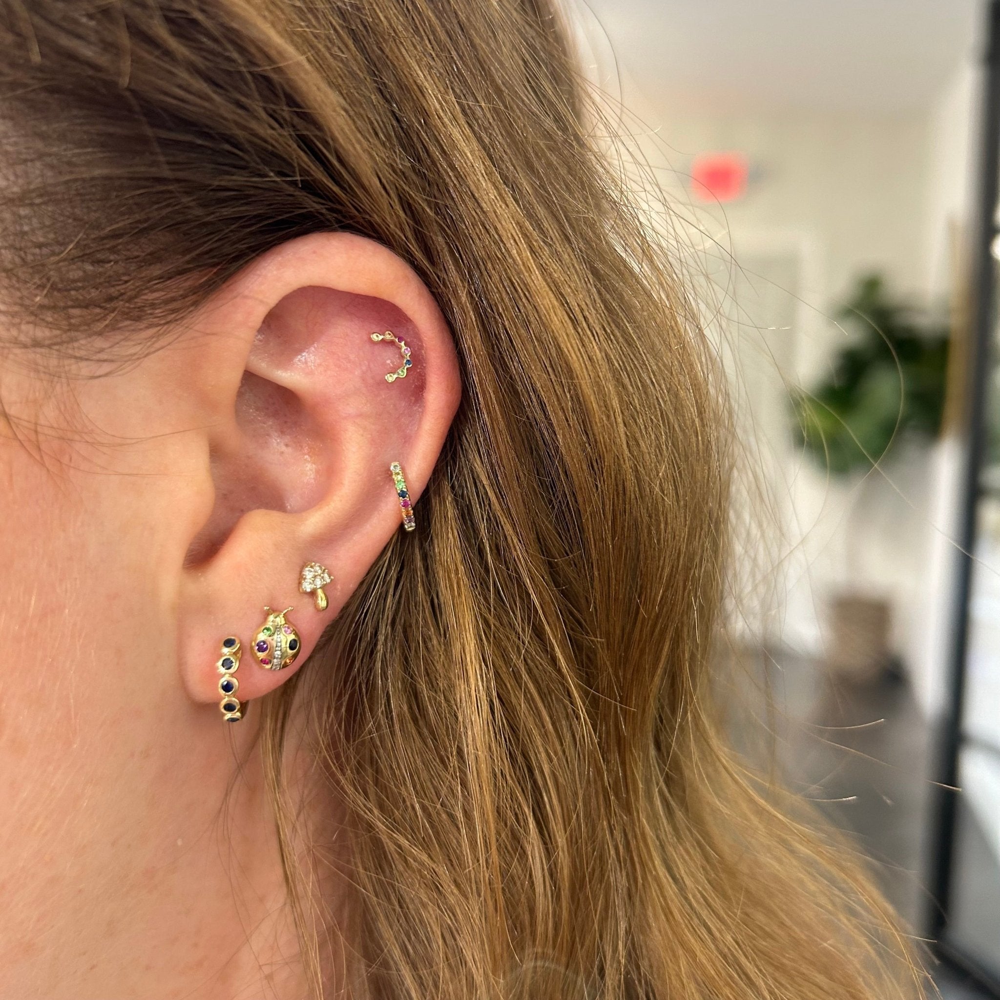 <li>Our 14k gold earring post might shift with continuous wear. If you feel huggies loosening, tighten the clasp by shifting the post downward.</li>
