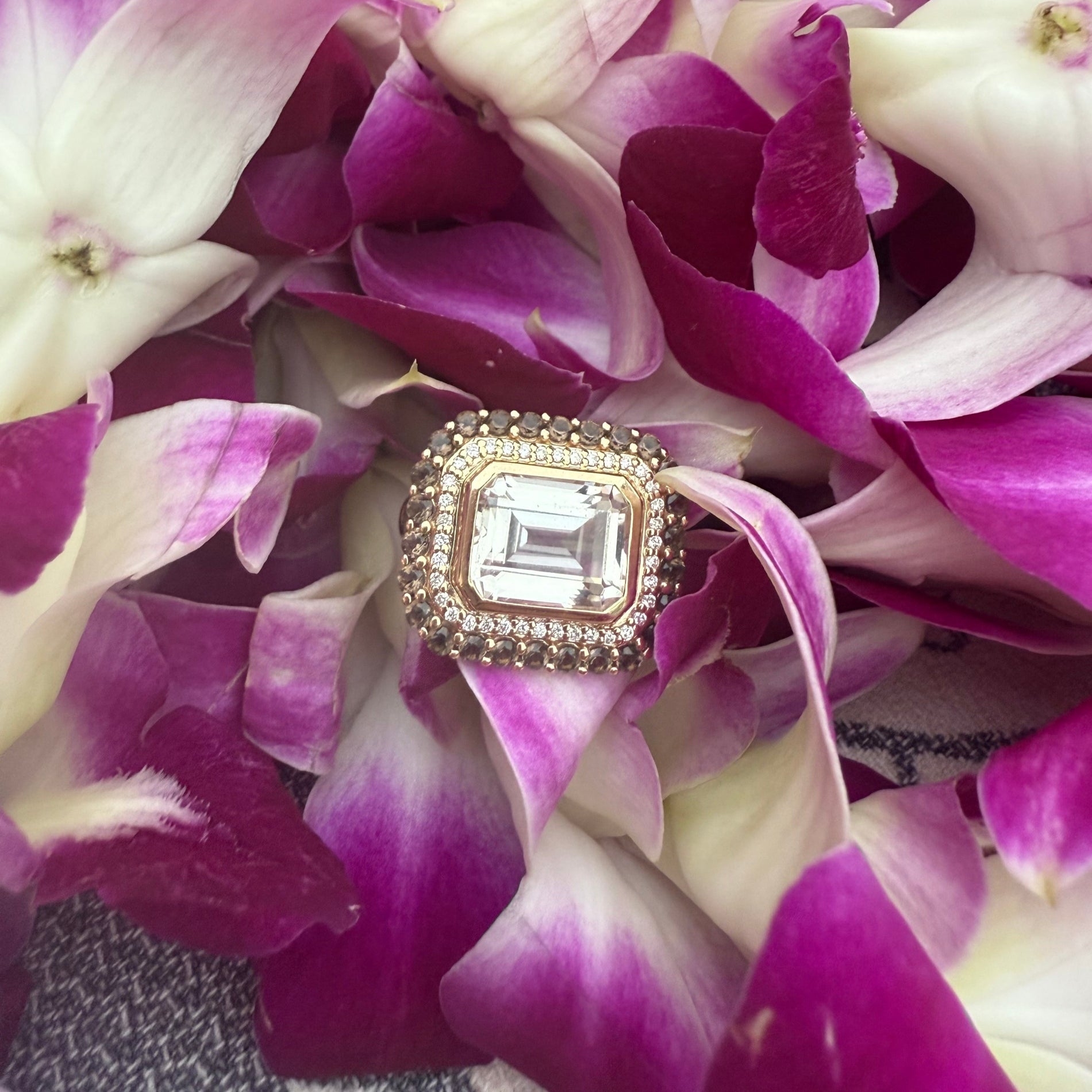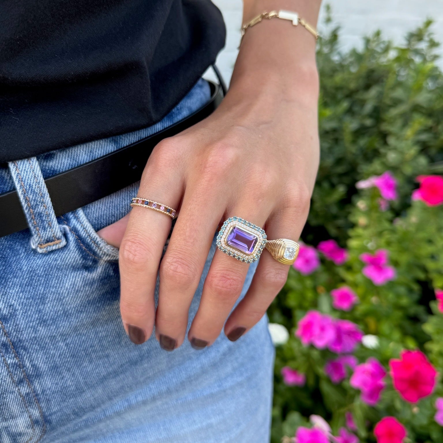 Inspired by a custom remake for Nicole Jaques, the Nicole Gemstone Ring blends modern elegance with classic charm. Now customizable with your choice of center and outer stones, it features a diamond inner halo for extra sparkle—designed to be as unforgettable as your story!